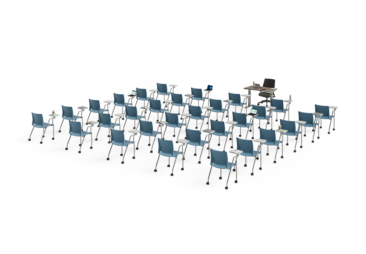 The classroom layout continues to be one of the most powerful ways to train. Impactful learning is active and engaging with our Rio seating with tablet arms.